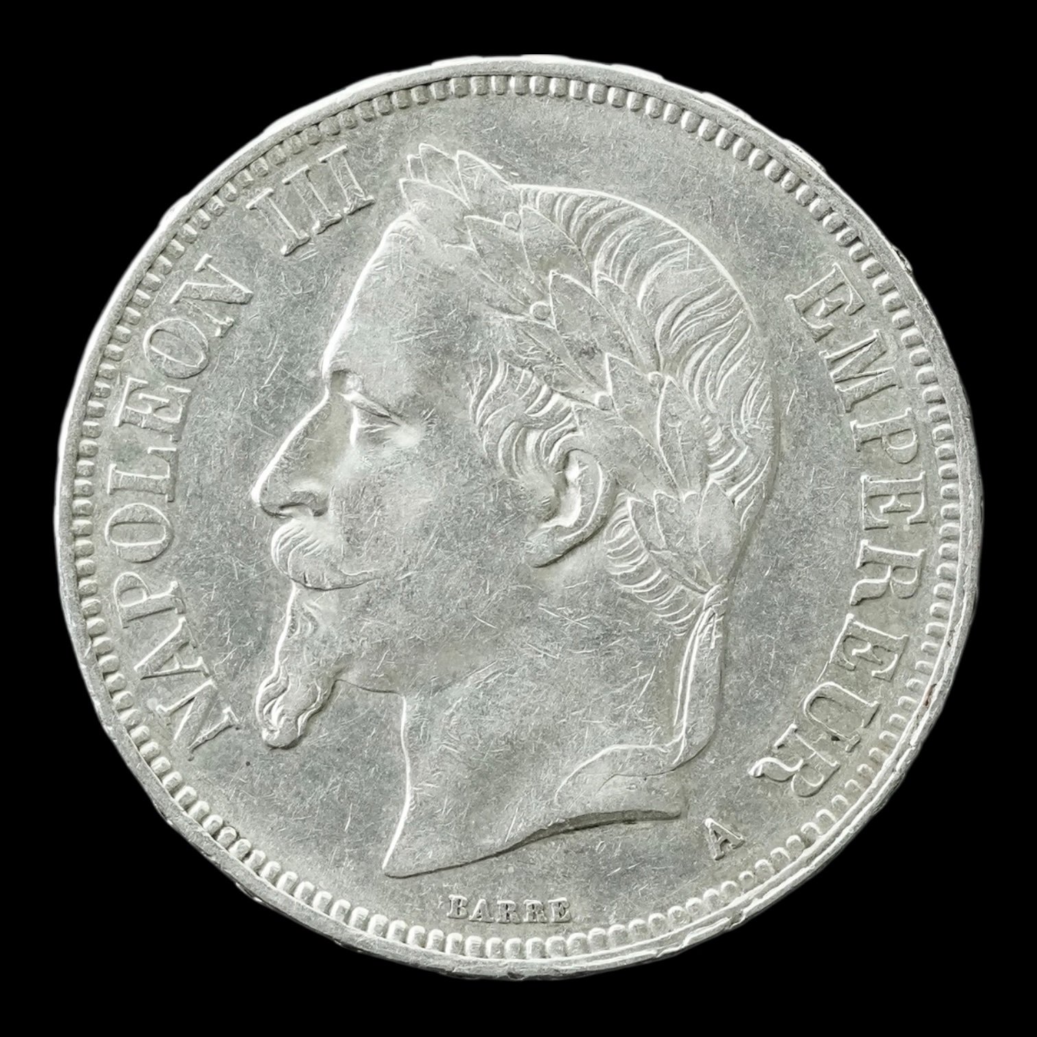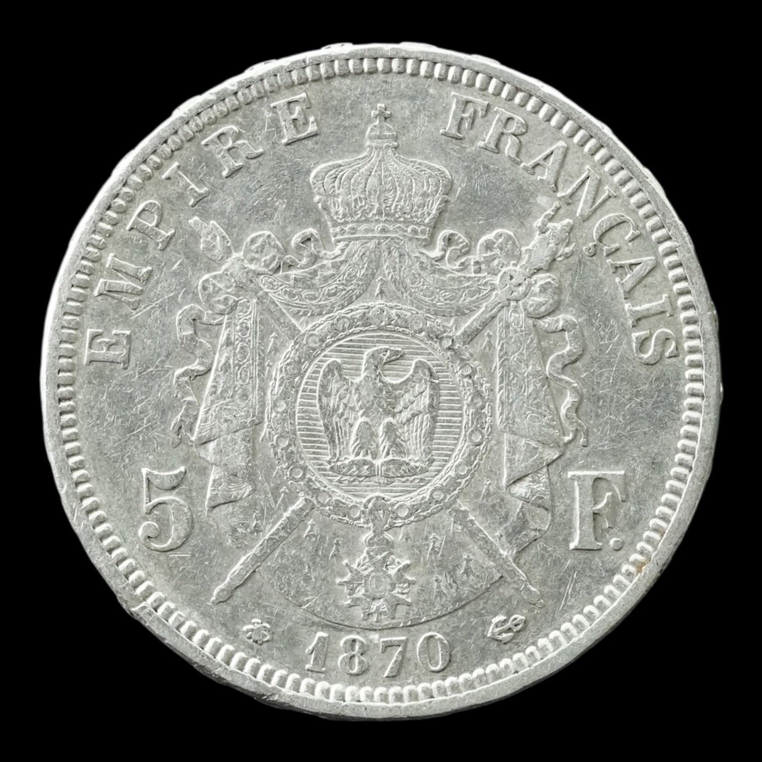 Observaciones: Último año de emisión de los 5 Francos de Napoleón III antes del inicio de la Tercera República. Moneda histórica y muy apreciada por los coleccionistas de “duros de plata” europeos.