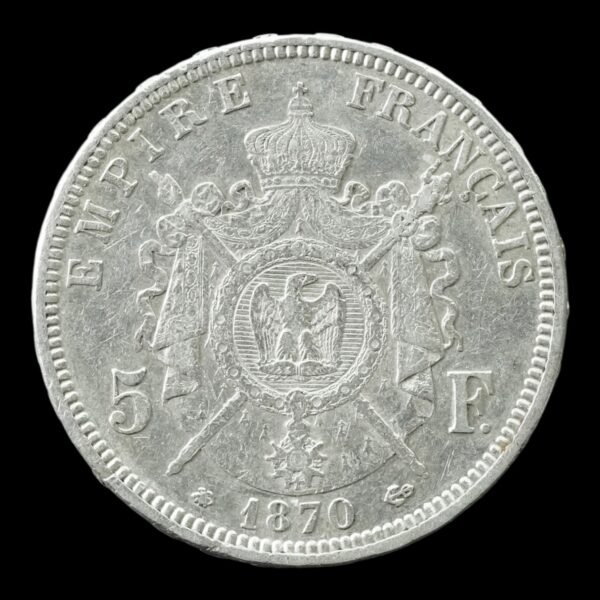 Reverso: Escudo imperial coronado con la leyenda EMPIRE FRANÇAIS y el valor 5 FRANCS 1870.