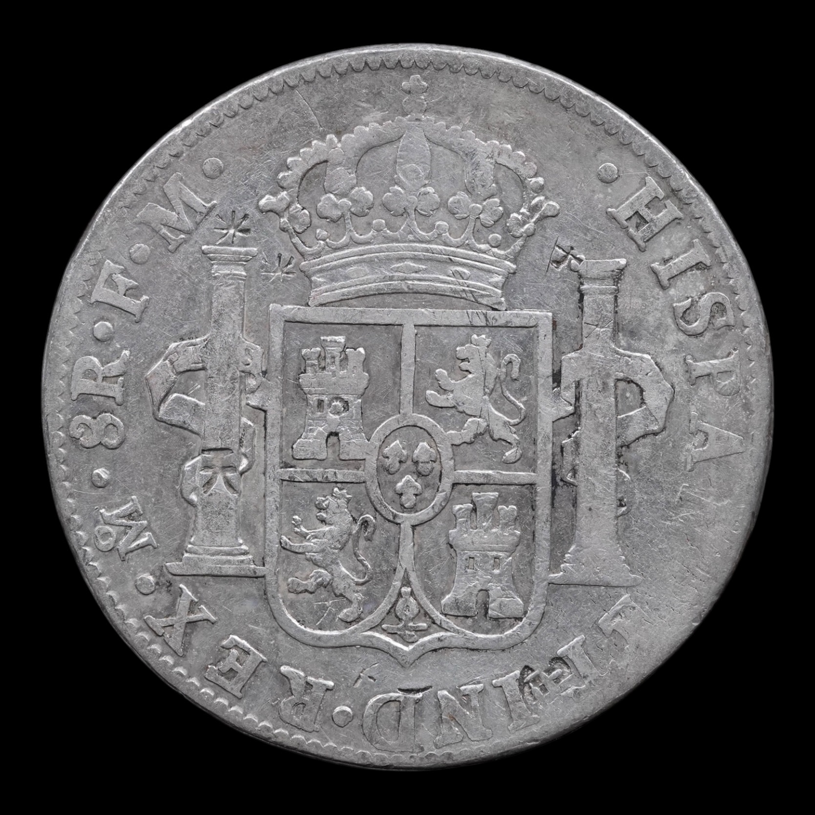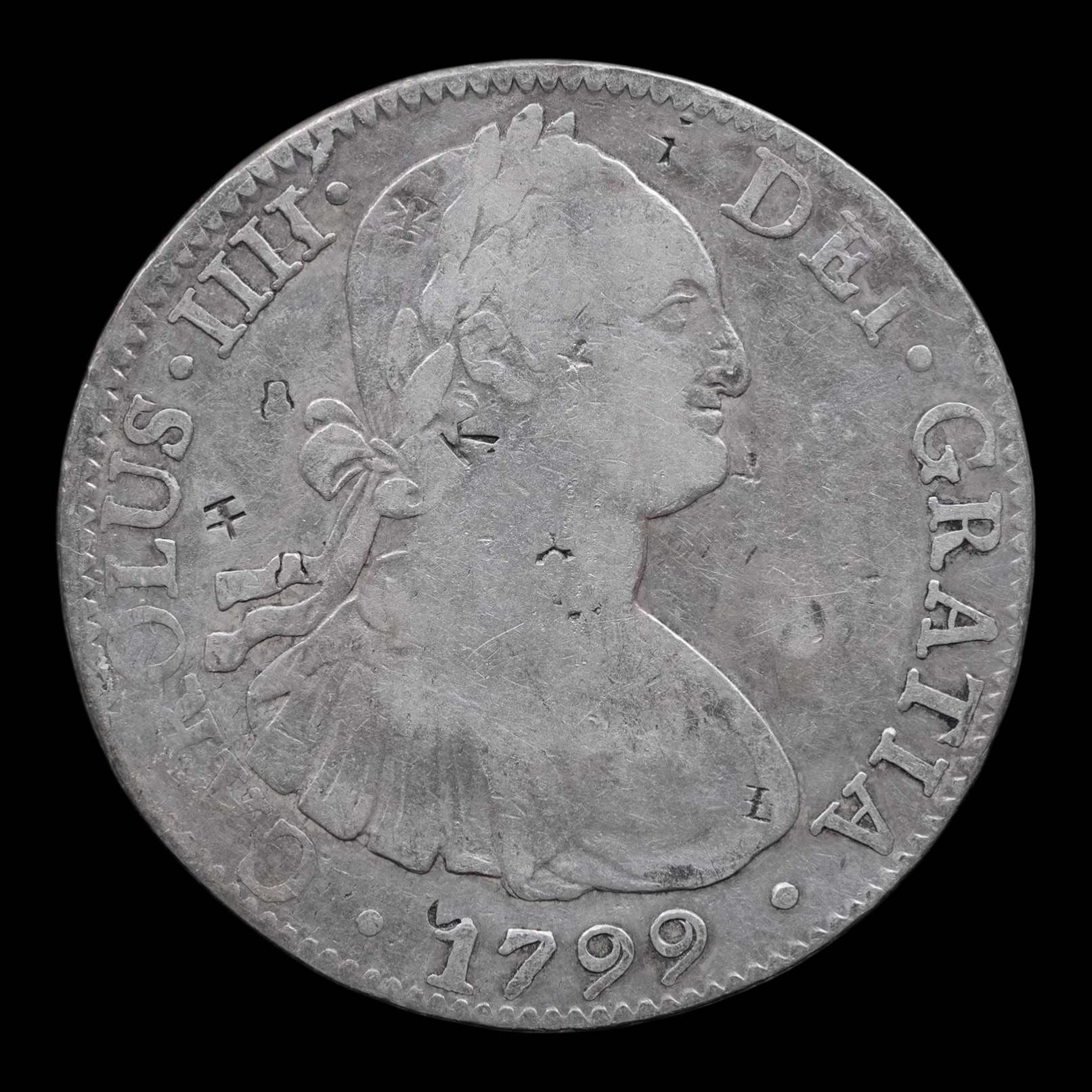 México – 8 Reales – 1799 Mo F.M. – “Carlos IV” – Plata (.903) – 26,55 g – Chopmarked (Resellos Orientales)