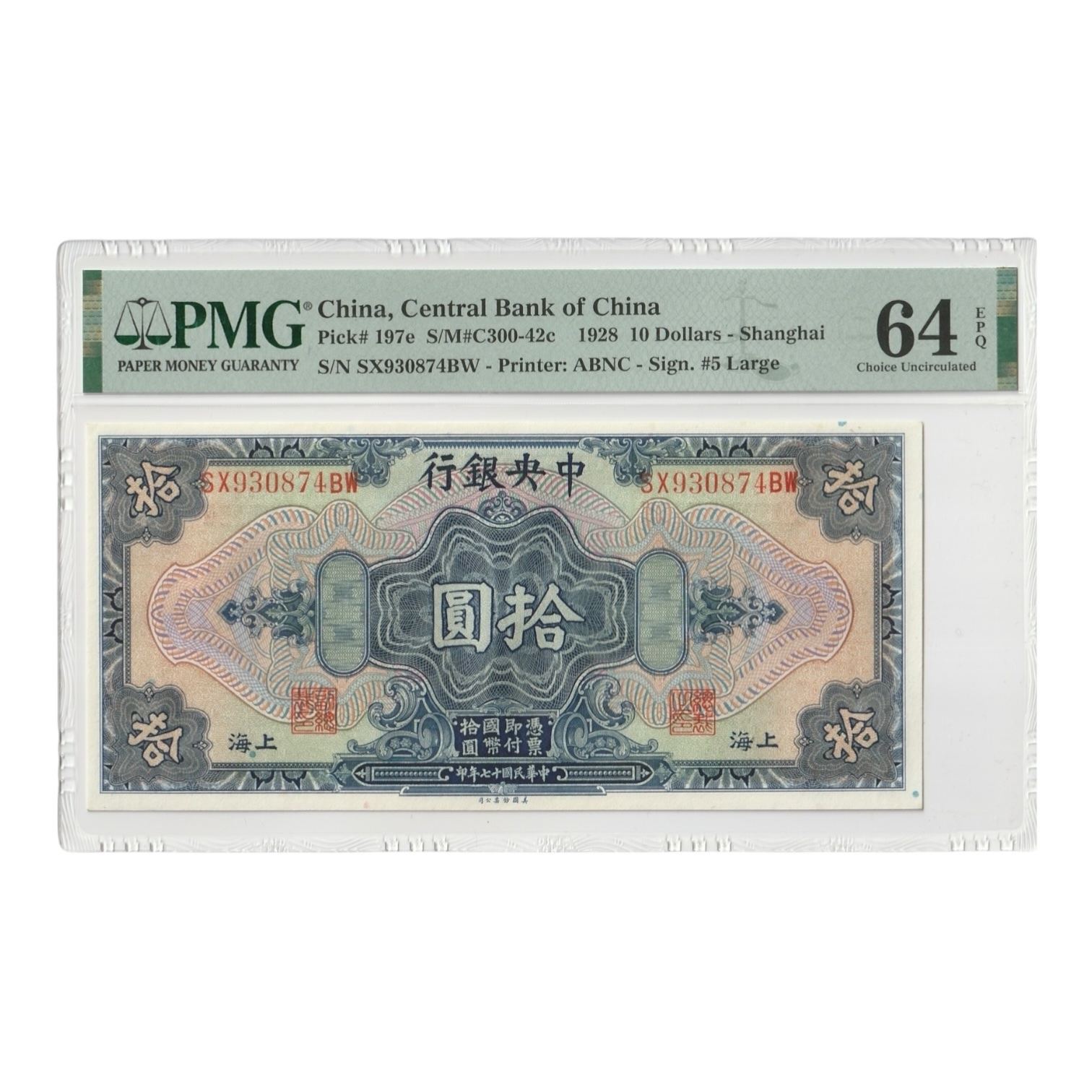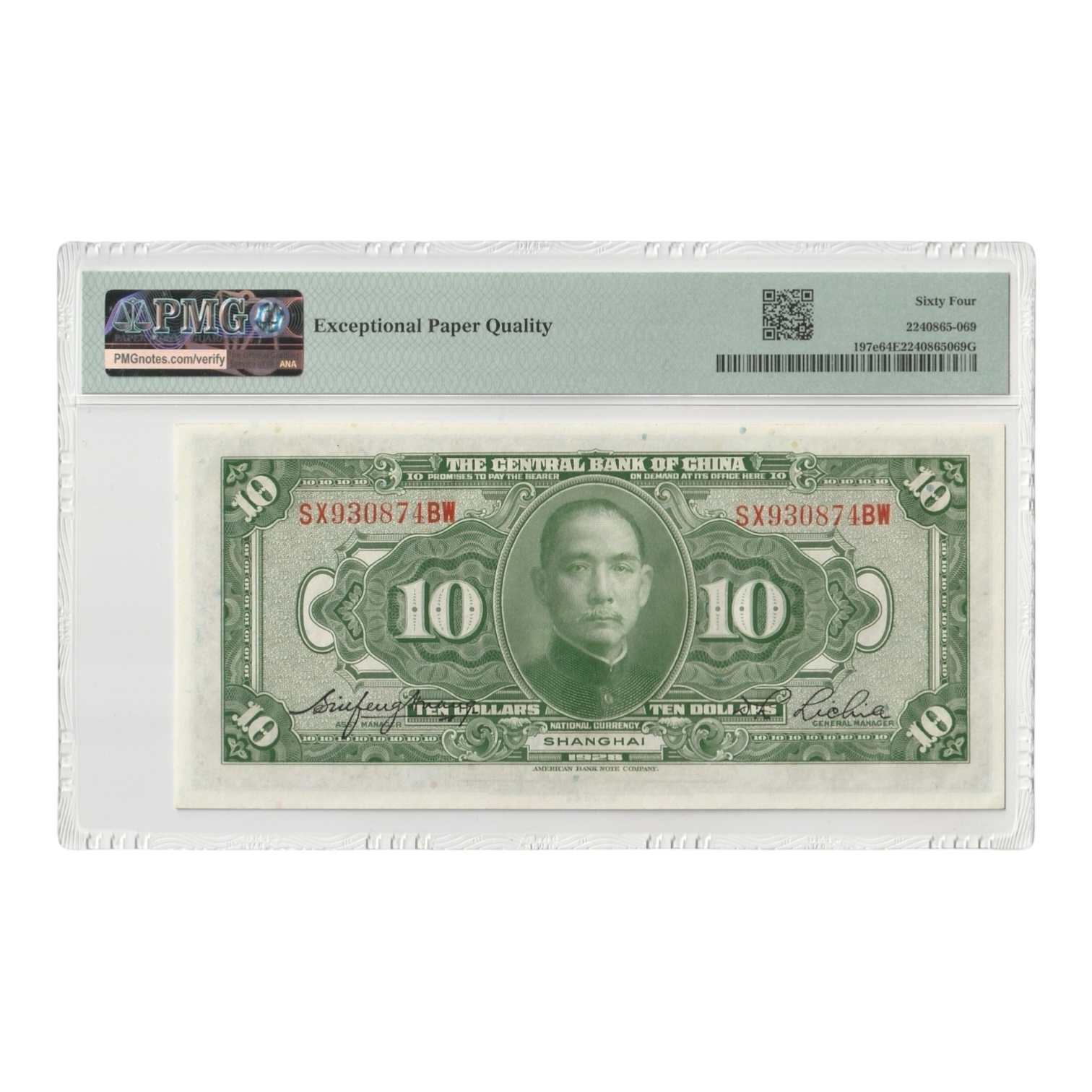 Billete 10 Dollares China 1928 Central Bank of China – PMG 64 EPQ