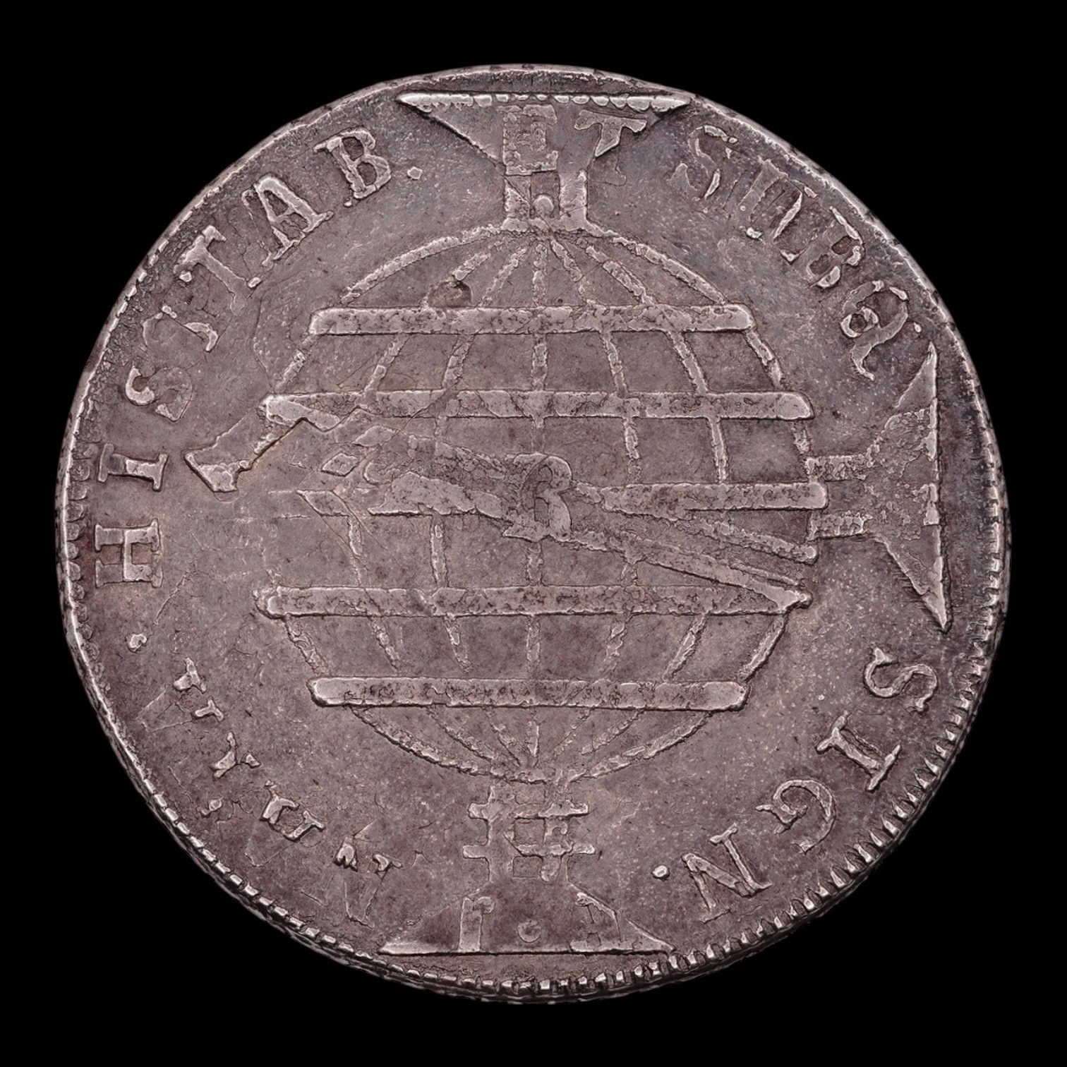 Moneda emblemática del reinado de Juan VI, acuñada sobre 8 Reales coloniales, muy apreciada por su historia y rareza.