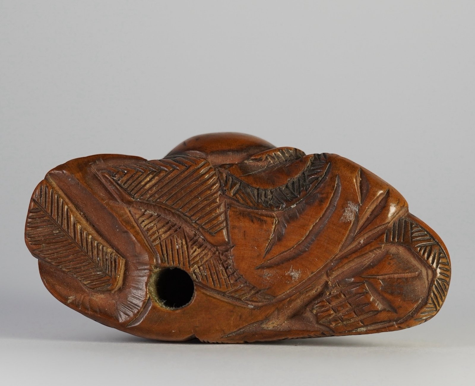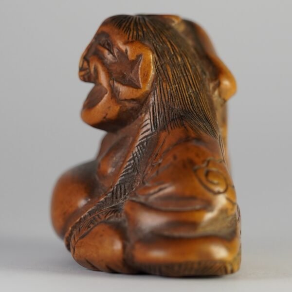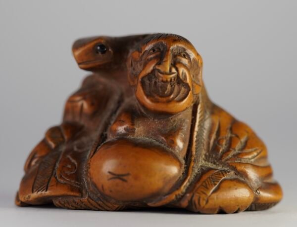 Netsuke de Madera Japonés – Hotei de la Fortuna con Rana
