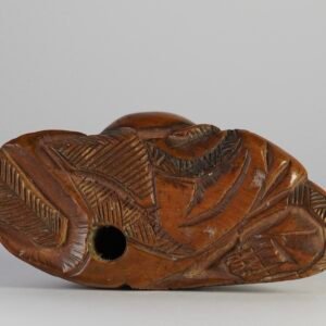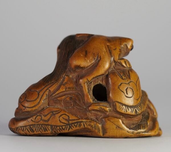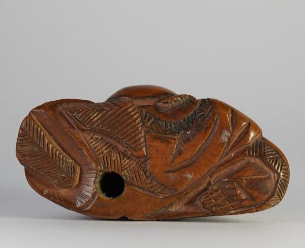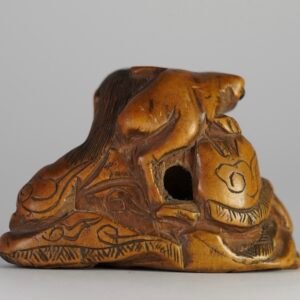 Exquisito netsuke japonés tallado en madera,representando a Hotei, el dios de la fortuna y la felicidad, acompañado de una rana, símbolo de la buena suerte y el retorno seguro. Una pieza llena de detalle, tradición y encanto oriental, ideal para coleccionistas y amantes del arte japonés.
