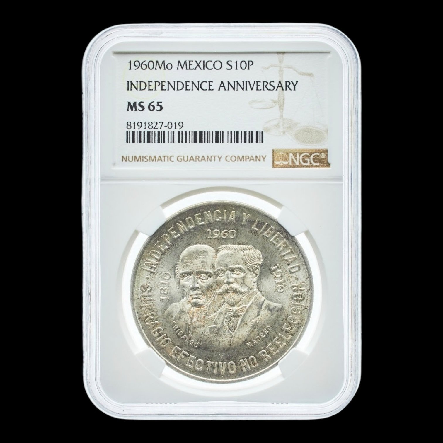México – 10 Pesos de Plata – 1960 – “Guerra de la Independencia” – 28,88 g Ley .900 – NGC MS65