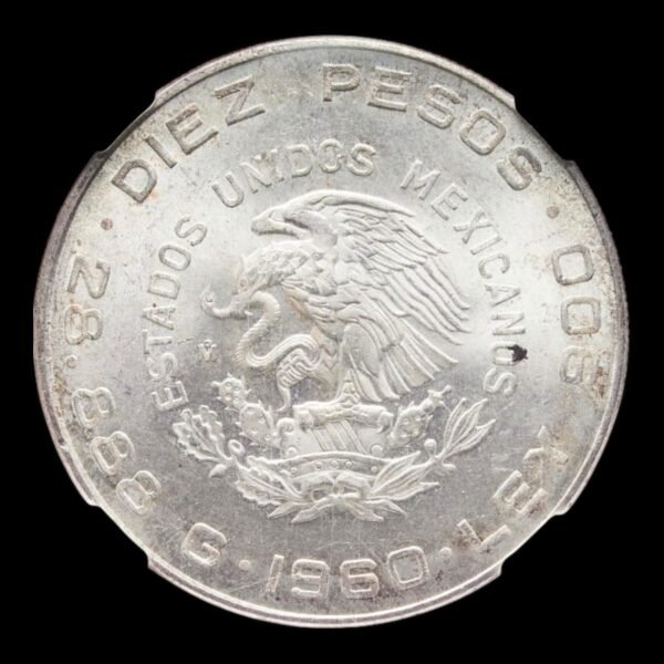 México – 10 Pesos de Plata – 1960 – “Guerra de la Independencia” – 28,88 g Ley .900 – NGC MS65