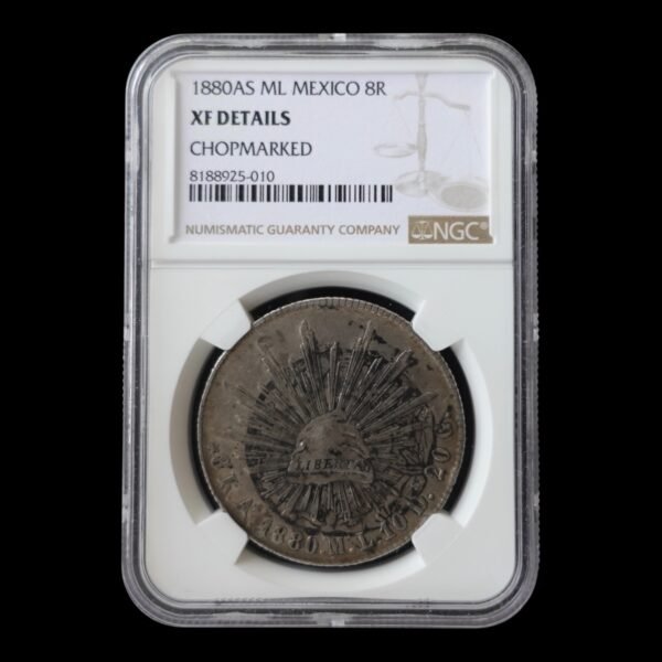 México – 8 Reales 1880 AS ML (Álamos) – Plata .903 – XF Details (Chopmarked) – NGC