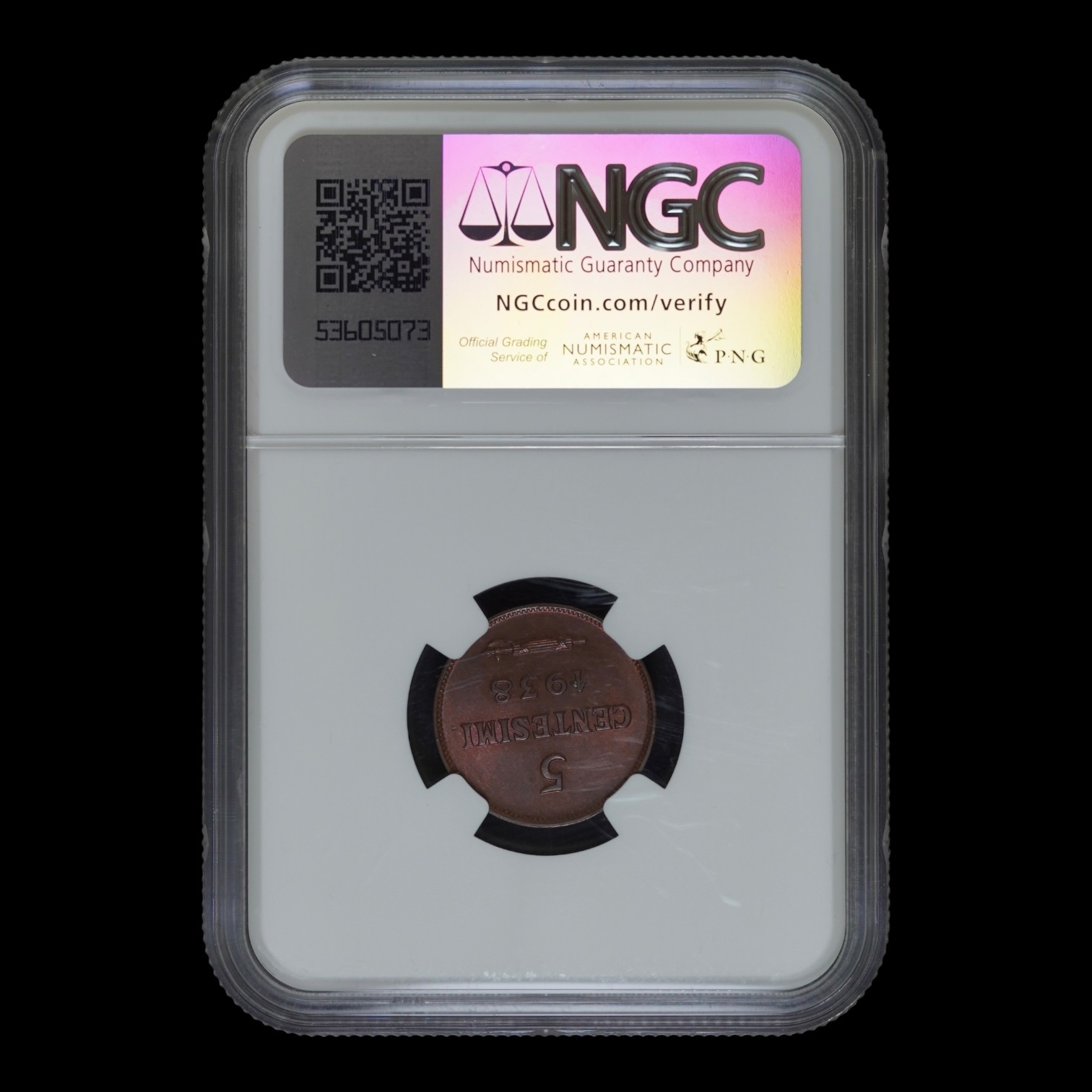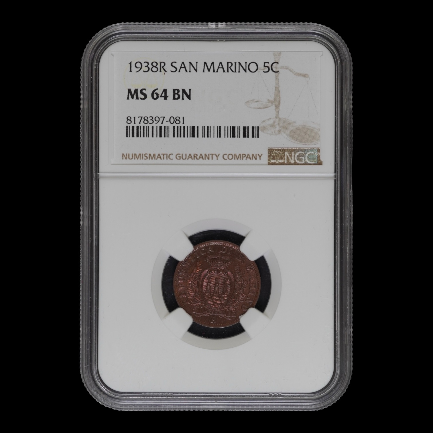 San Marino – 5 Centesimi de Bronce – 1938 R – NGC MS64 BN