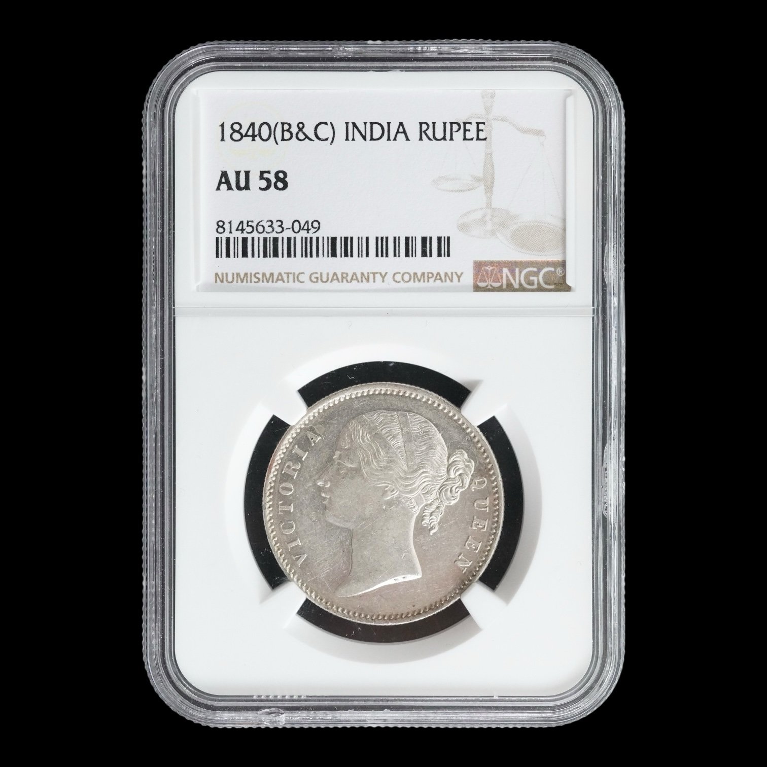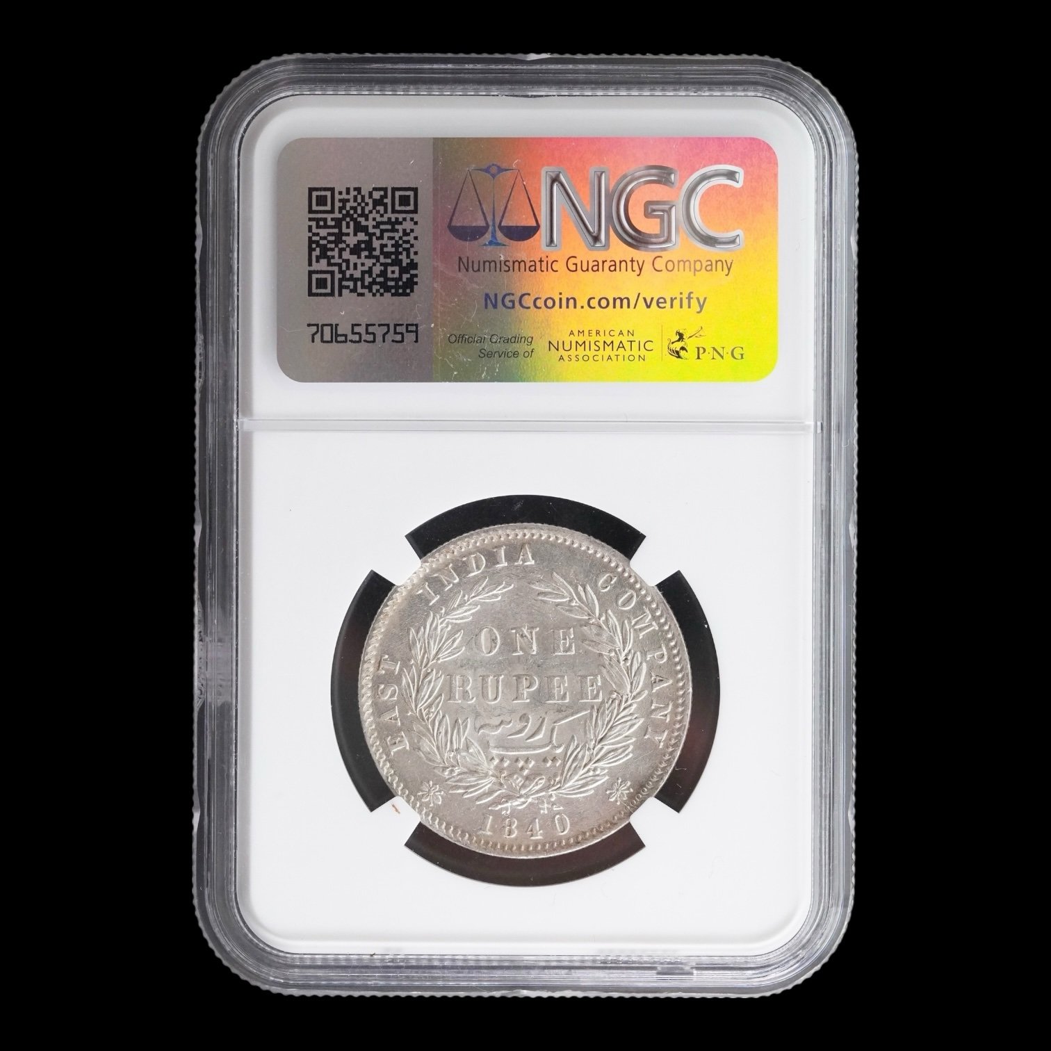• Reverso: Valor ONE RUPEE en el centro, rodeado por guirnaldas y la inscripción EAST INDIA COMPANY.