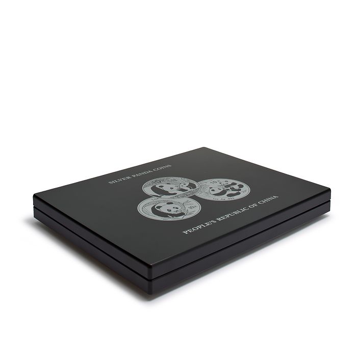Este estuche de alta calidad de color negro es ideal para coleccionar las populares monedas de plata. Panda en cápsulas originales, tanto en modelo de 1 oz. como en modelo de 30 g (a partir de 2016). 1 bandeja con superficie aterciopelada de color negro y 20 divisiones redondas (45,4 mm Ø). Con un elegante grabado en color plata en la tapa y en su parte interior con bonitos motivos de las monedas de plata Panda. Interior de la tapa acolchado con raso negro. Con un cierre magnético seguro y discreto.